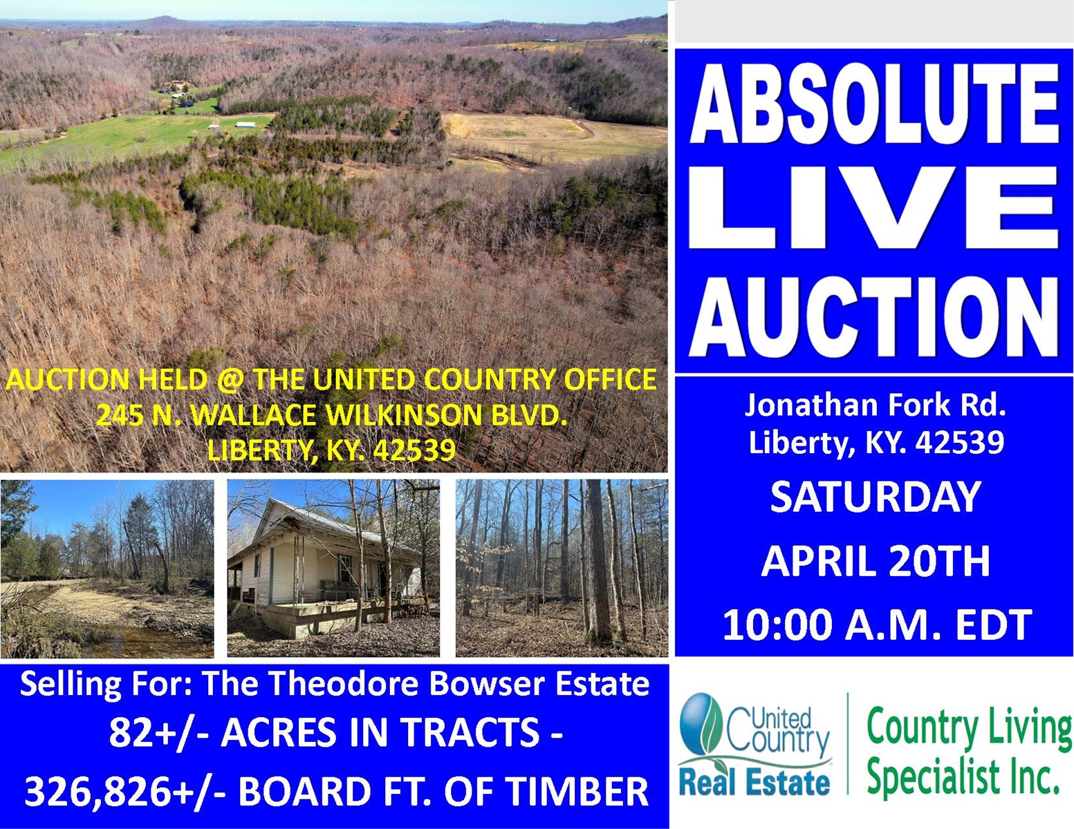 ABSOLUTE LIVE AUCTION: Come join us on auction day as we sell these properties for the Theodore Bowser Estate. Auction will be held live at the office of United Country Real Estate in Liberty. (245 N. Wallace Wilkinson Blvd. Liberty, KY. 42539.) Up for ABSOLUTE LIVE AUCTION will be this 80+/- acre tract containing approx. 52+/- acres of marketable timber with the remainder in young pines that could be taken out to give cleared pasture land. Recent timber cruise shows 326,826 board feet of marketable timber on this tract. County water and electricity are available at the road. About a quarter mile east of this tract is another 2.03+/- acres with an old abandoned house that will be up for auction as well. This property is entirely wooded but has space to clear a spot for a new home or mobile/manufactured residence. No restrictions. Come see us on auction day ready to bid on and buy these properties!